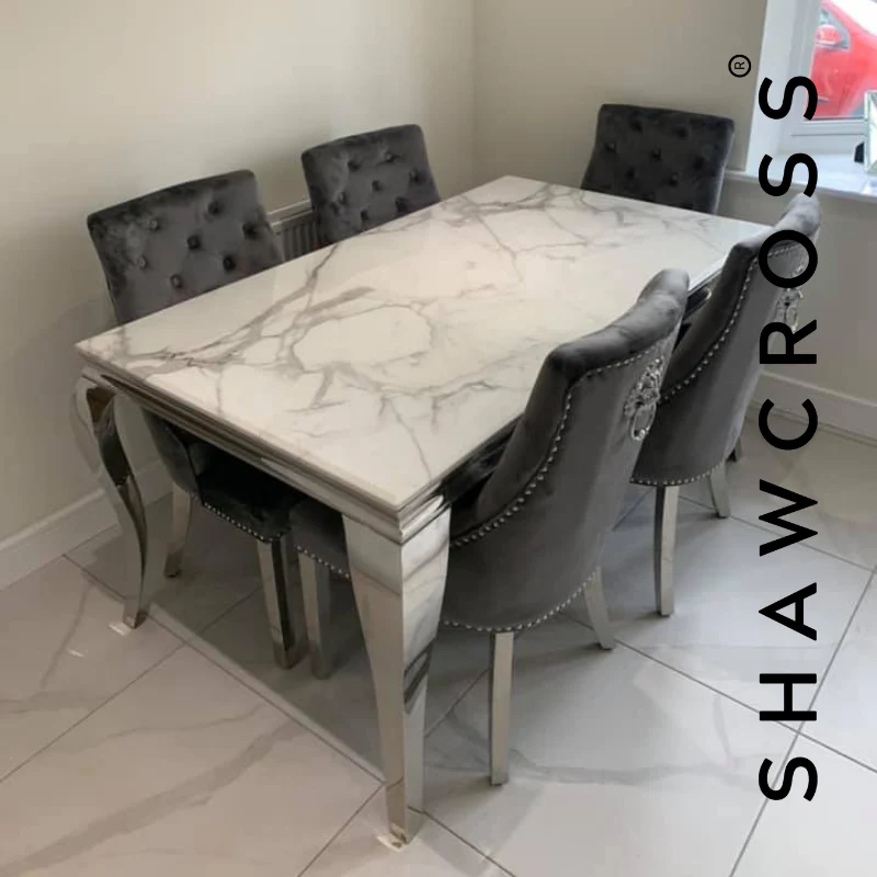 Louis Marble 1.8M Or 1.5M Dining Table And Cheshire Velvet Knocker Chairs