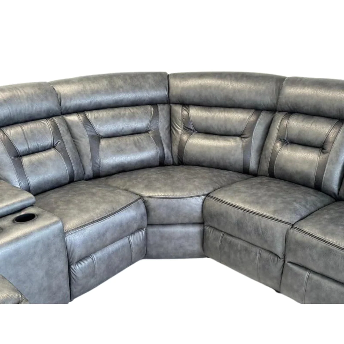 The Nevada Corner Sofa features electric recliners on both end seats. The Grey Elephant skin style’ fabric has modern Black trim on the backs. The sofa also contains a console unit in the right hand seat and has electric recliners on the seats at both ends.
